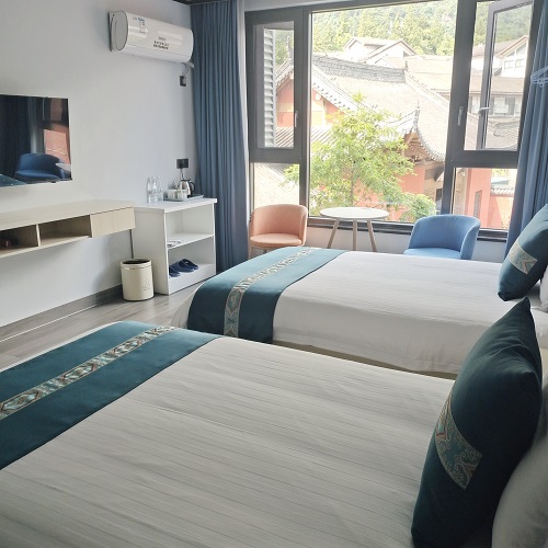 当三清山的晨光透过落地窗,轻轻唤醒同行的伙伴时,你们正舒适地躺在两张1.2米标准床上。蓝绿色抱枕与窗外传统屋顶的黛瓦相映成趣,白色矮柜上的矿泉水映着微微晨光——这一刻,「朵朵的家」为结伴而行的你们,准备好了恰到好处的独立与共享。